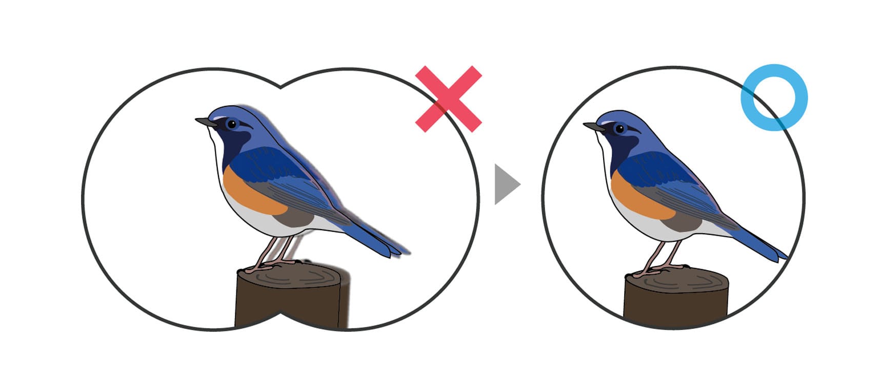 まっすぐのぞいているつもりでも、癖でズレることがあります。特に遠くを見るときは、少しのズレも双眼鏡の視界では大きくズレます。双眼鏡を構えたとき、まっすぐ対象に向いているか、外からチェックしてもらうといいでしょう。