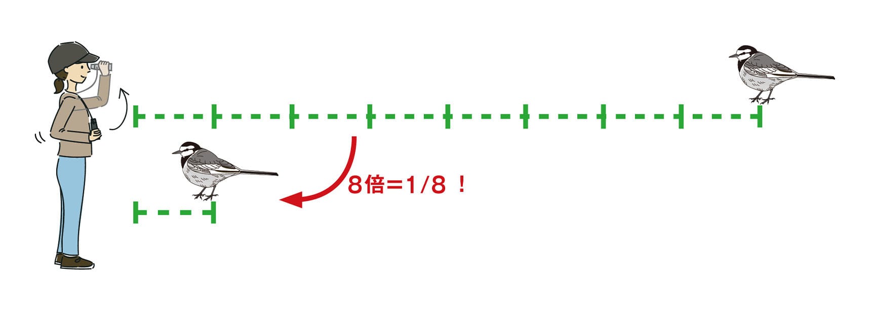 双眼鏡や望遠鏡の倍率は、対象との距離を「1/倍率」にすることを意味します。つまり8倍の双眼鏡の場合、20メートル先にいる鳥は、20メートルの1/8の距離=2.5メートル先にいるように見えることになります。